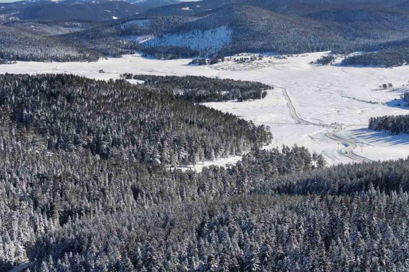 Bolu’nun güneydoğusunda Kartalkaya yolu üzerinde bulunan 14 köy yaylasından oluşan Sarıalan Yaylası, kış mevsiminin gelmesiyle birlikte beyaz örtüyle kaplandı. Yaylada oluşan kış manzarası havadan görüntülendi.