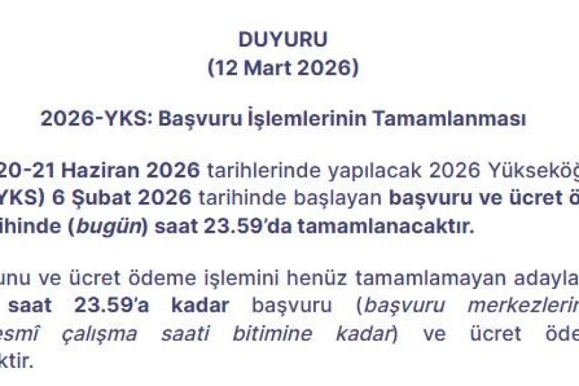 MEB tarafından 20-21 Haziran tarihlerinde yapılacak 2026 Yükseköğretim Kurumları Sınavı’na (2026-YKS) 6 Şubat tarihinde başlayan başvuru ve ücret ödeme işlemleri, bugün saat 23.59’da tamamlanacak.