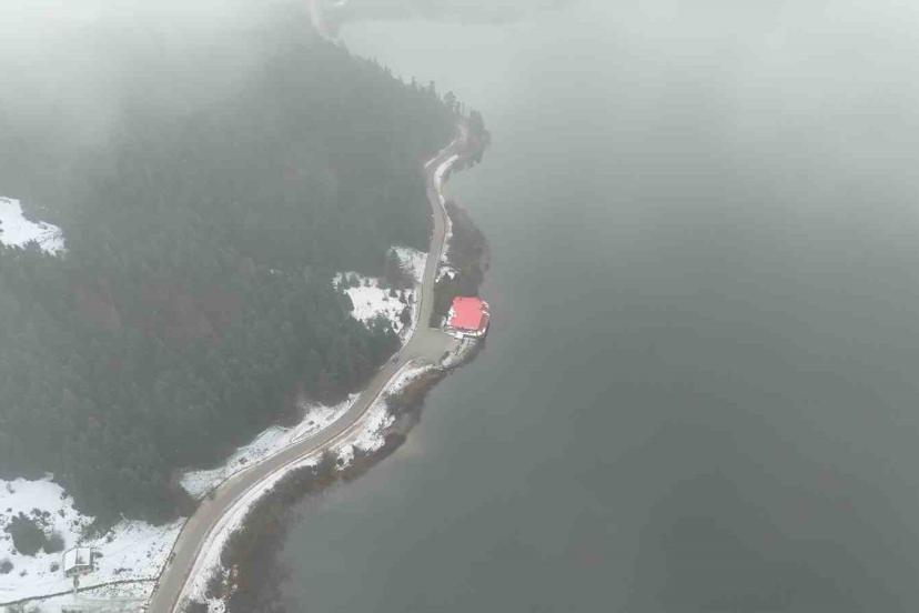 Bolu’nun doğa harikası Abant Gölü Milli Parkı, dağların eteklerini kaplayan kar ve göl üzerine çöken sisle birlikte kartpostallık manzaralar oluşturdu.