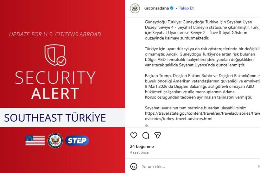 Yapılan açıklamada, bölgede artan riskler nedeniyle ABD Dışişleri Bakanlığı’nın Türkiye’nin güneydoğu bölgesi için seyahat uyarısını "Seviye 4-Seyahat etmeyin" düzeyine yükselttiği, Türkiye geneline yönelik uyarının ise "Seviye 2-İlave ihtiyat gösterin" seviyesinde kaldığı belirtildi. ABD Dışişleri Bakanlığı’ndan yapılan açıklamada, "Türkiye için uyarı düzeyi ya da risk göstergelerinde bir değişiklik olmamıştır. Ancak güneydoğu Türkiye’de artan risk bulunan bölge, ABD Temsilcilik faaliyetlerindeki yapılan değişiklikleri yansıtacak şekilde seyahat uyarısında güncellenmiştir. Başkan Trump, Dışişleri Bakanı Rubio ve Dışişleri Bakanlığının en büyük önceliği Amerikan vatandaşlarının güvenliği ve emniyetidir. 9 Mart 2026’da Dışişleri Bakanlığı, acil görevli olmayan ABD hükümeti çalışanları ve aile mensuplarının Adana Konsolosluğu’ndan tedbiren ayrılmaları talimatını vermiştir" denildi.