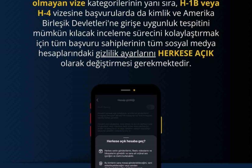 ABD’nin Ankara Büyükelçiliği, vize başvuru süreçlerinde uygulanacak yeni düzenlemeyi sosyal medya hesabından yaptığı açıklama ile duyurdu. Büyükelçiliğin yaptığı paylaşımda, "15 Aralık 2025 tarihinden itibaren ABD kanunları uyarınca F, M ve J türü göçmen olmayan vize kategorilerinin yanı sıra, H-1B veya H-4 vizesine başvurularda da kimlik ve Amerika Birleşik Devletleri’ne girişe uygunluk tespitini mümkün kılacak inceleme sürecini kolaylaştırmak için tüm başvuru sahiplerinin tüm sosyal medya hesaplarındaki gizlilik ayarlarını herkese açık olarak değiştirmesi gerekmektedir" ifadeleri kullanıldı.