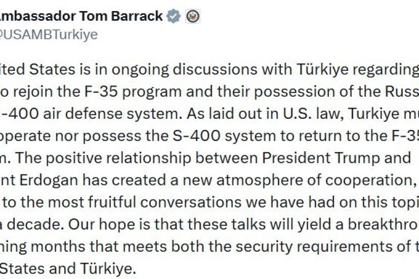 ABD’nin Ankara Büyükelçisi ve Suriye Özel Temsilcisi Tom Barrack, sosyal medya platformu X üzerinden yaptığı paylaşımda, Türkiye’nin F-35 programına geri dönüşü konusunda yürütülen müzakerelere ilişkin açıklamalarda bulundu. Türkiye ile görüşmelerin sürdüğünü ifade eden Barrack, "ABD yasalarına göre, Türkiye’nin F-35 programına geri dönmesi için S-400 sistemlerini kullanmaması ve bulundurmaması gerekiyor" ifadelerini kullandı.