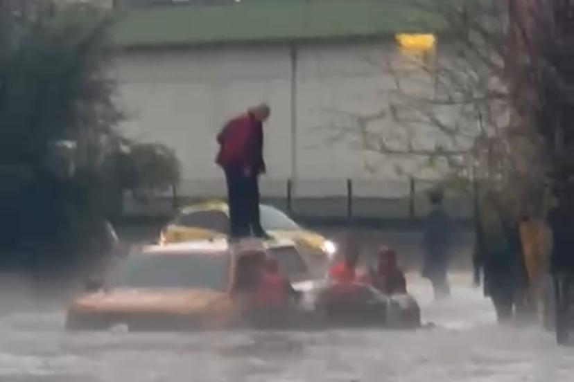 Adana’da dolu ve sağanak nedeniyle göle dönen yolda otomobilin üzerinde çıkan 2 kişi itfaiye ekipleri tarafından kurtarıldı.