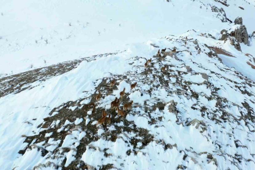 Koçali Köyü yakınlarında ve rakımı yüksek dağlık bölgelerde yaşayan yaban keçileri, yağan kar ile birlikte yiyecek bulmakta zorluk çekiyor. Yiyecek bulmak için sürüler halinde kar üzerinde ilerleyen yaban keçileri, drone ile havadan görüntülendi. Onlarca yaban keçisinin, 1 metreyi geçen kar kalınlığının olduğu yerlerden kayalık bölgelere giderek yiyecek aradığı görüldü.