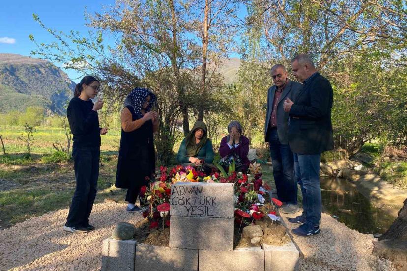 Düziçi ilçesindeki Yeşil Mezarlığı’nda bulunan Adnan’ın kabrini ziyaret eden ailesi, arkadaşları ve vatandaşlar çiçekler bırakıp dualar ediyor.