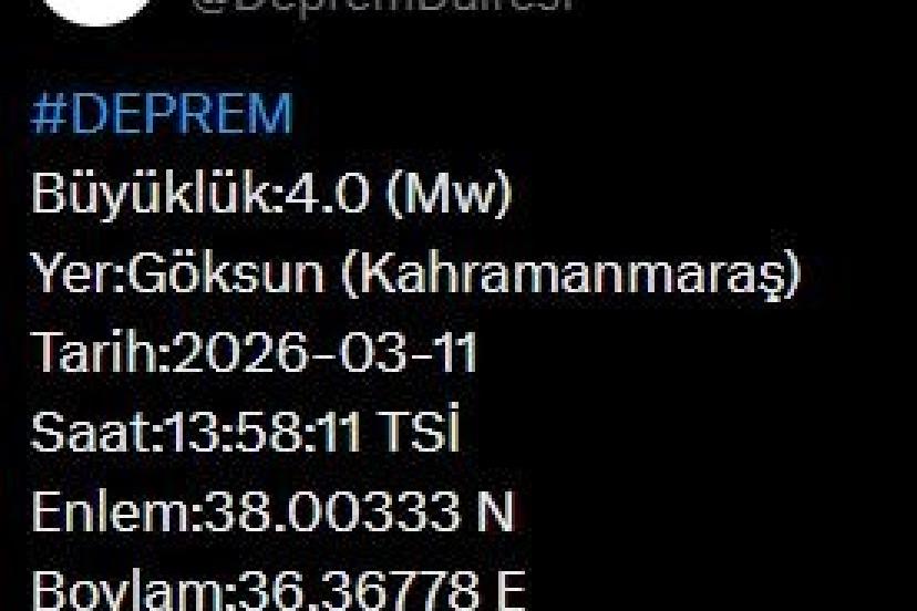 AFAD’ın paylaştığı bilgilere göre, Kahramanmaraş’ın Göksun ilçesinde saat 13.58’de 4.0 büyüklüğünde deprem meydana geldi. Merkezi Göksun olan depremin derinliği 7 kilometre olarak ölçüldü.