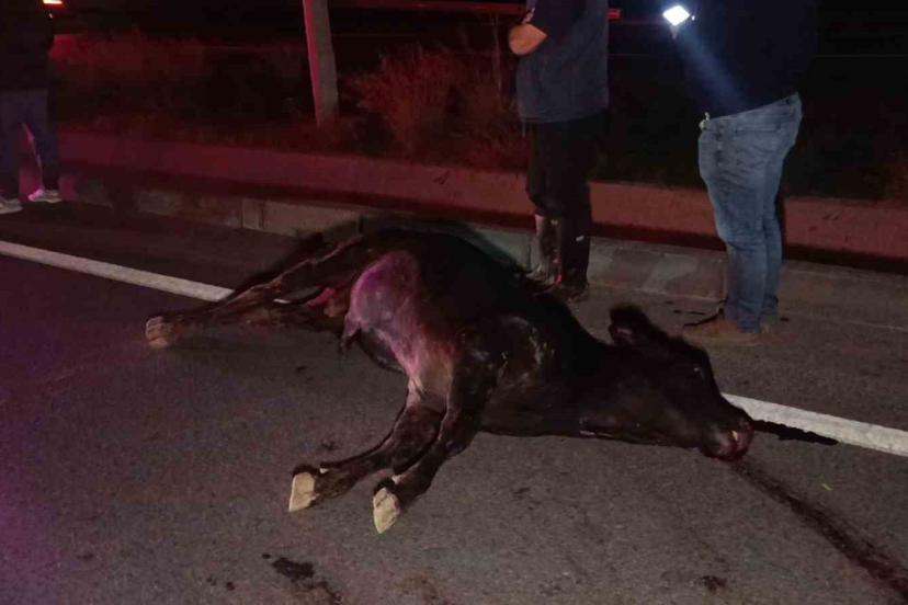 Ağıldan kaçan inek, araçların çarpması sonucu telef oldu