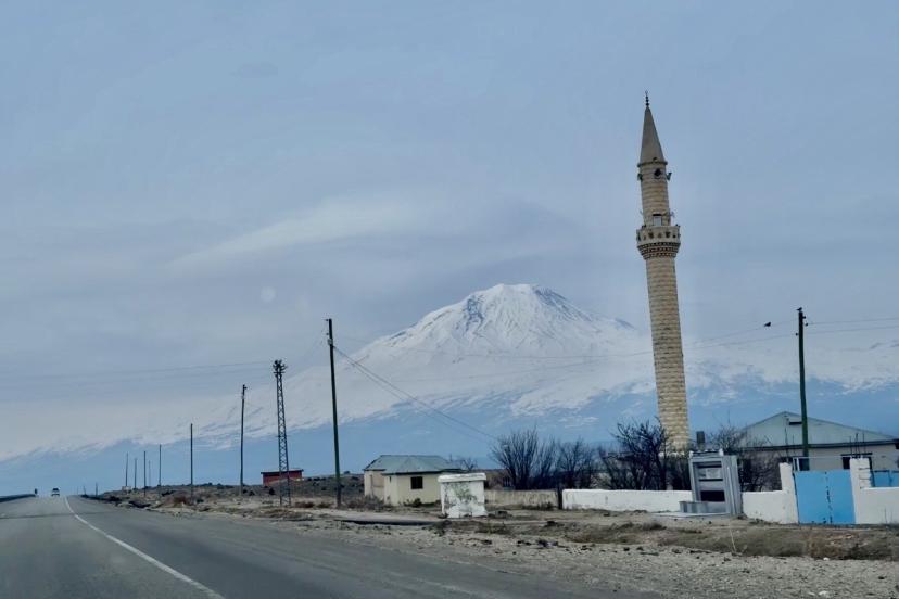 Yol boyunca sürücülere manzarasıyla eşlik eden Ağrı Dağı, bölgedeki tepelerin arasında ihtişamıyla yükseliyor.