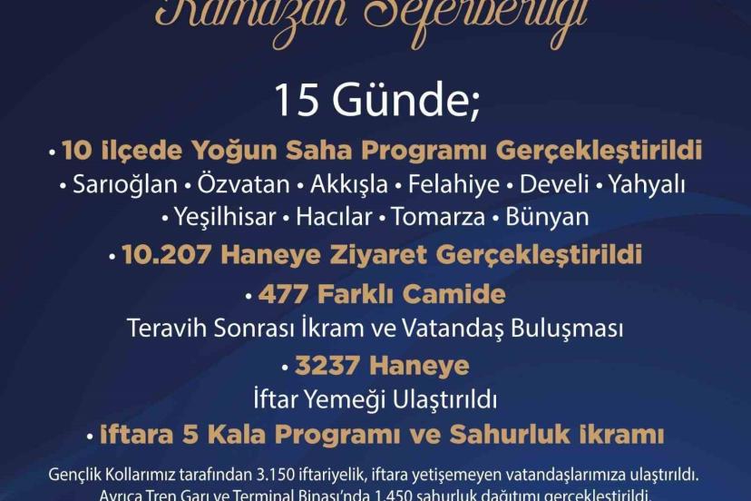 AK Parti Kayseri İl Başkanlığı tarafından çalışmalarla ilgili yapılan açıklamada, "15 günde Sarıoğlan, Özvatan, Akkışla, Felahiye, Develi, Yahyalı, Yeşilhisar, Hacılar, Tomarza ve Bünyan’da gönül gönüleydik. 10 ilçede yoğun saha programı gerçekleştirdik. 10 bin 207 haneye misafir olduk. 477 farklı camide teravih sonrası hemşehrilerimizle buluştuk. 3 bin 237 haneye iftar yemeği ulaştırdık. İftara 5 Kala Programı ve Sahurluk İkramı programlarında Gençlik Kollarımız tarafından 3 bin 150 iftariyelik, iftara yetişemeyen vatandaşlarımıza ulaştırıldı. Ayrıca Tren Garı ve Terminal Binası’nda bin 450 sahurluk dağıtımı gerçekleştirildi. Bu mübarek ayın bereketini, dayanışmasını ve kardeşliğini Kayseri’nin dört bir yanında paylaşmaya devam ediyoruz" ifadelerine yer verildi.