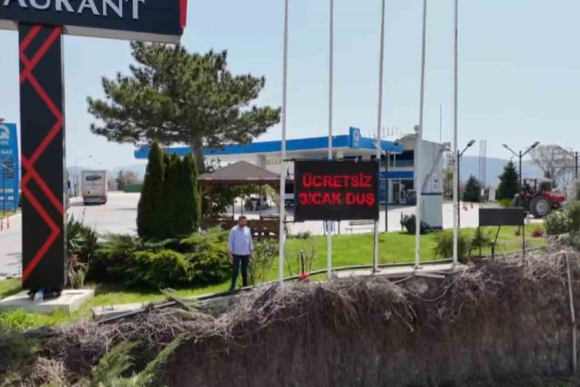 Amasya – Suluova karayolunda akaryakıt ürünlerinin fiyat tarifesinin yer aldığı pano sıradışı bir uygulamaya davetiye çıkarıyor. Gece, gündüz fark edilebilen ‘ücretsiz sıcak duş’ yazısını gören şaşırıp kalıyor. Merak edenler istasyondaki 2 duş kabiniyle karşılaşıyor. Duş yapan sürücülere çay da ikram ediliyor.