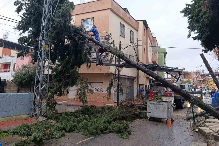 Şiddetli rüzgar ve fırtına nedeniyle ilçe genelinde devrilen ya da kırılma riski taşıyan ağaçlara müdahale edildi. Park ve Bahçeler Müdürlüğü ekipleri, araç ve yaya trafiğini tehlikeye düşüren ağaçları kaldırırken, riskli dalları budayarak ulaşımın aksamamasını sağladı.