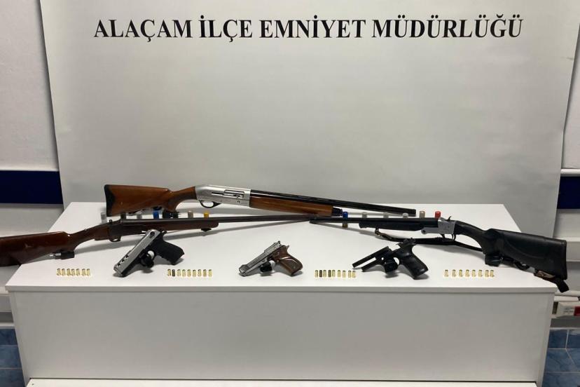 Alaçam İlçe Emniyet Müdürlüğü ekipleri, yasa dışı silahlanma ve hırsızlık olaylarının önlenmesine yönelik yürütülen çalışmalar kapsamında iki ayrı adrese operasyon düzenledi. Ş.D. (43) isimli şahsın ikametinde yapılan aramalarda 1 adet ruhsatsız tabanca, 1 adet çalıntı motosiklet, 2 adet kurusıkı tabanca, 2 adet ruhsatsız av tüfeği, 3 adet 6136 SKM kapsamında bıçak, 2 adet amaç dışı bıçak, 33 adet kurusıkı mermisi ve 38 adet av tüfeği fişeği ele geçirildi. Ayrıca yapılan çalışmada D.İ. (63) isimli şahıstan da 1 adet ruhsatsız av tüfeği ele geçirildi.