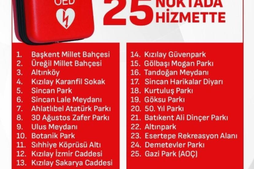 Ankara Valiliği, ani gelişen kalp durmaları vakalarına karşı Otomatik Eksternal Defibrilatör (OED) şok cihazlarının belirlenen 25 noktaya yerleştirildiğini açıkladı.