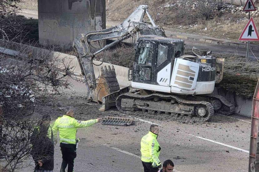 Ankara’nın Elmadağ ilçesinde, bir tırın üzerinde bulunan kepçe, köprü altından geçiş sırasında köprüye takılarak yola düştü ve facia kıl payı atlatıldı.