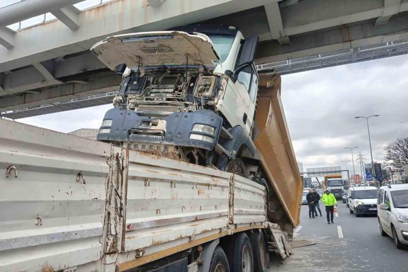 Ankara’da, üzerine hafriyat kamyonu yüklenmiş tır seyir halindeyken üst geçide çarparak sıkıştı.