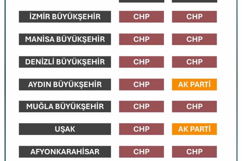 2026 yılının ilk üç ayına ait verilerle hazırlanan araştırma sonuçları, Ege Bölgesi’nde yerel seçimlere ilişkin güncel tabloyu ortaya koydu. Sonuçlara göre Aydın, Uşak ve Kütahya sınırlarında yaşayan vatandaşların son seçimlere göre tercih değiştirdiği belirtildi. Araştırmada Aydın Büyükşehir Belediyesi için dikkat çeken bir değişim de görüldü. 31 Mart 2024 yerel seçimlerinde büyükşehir belediyesini Cumhuriyet Halk Partisi (CHP) kazanırken, son anket verilerine göre bugün seçim yapılması halinde Adalet ve Kalkınma Partisi’nin (AK Parti) ilk sırada yer aldığı belirtildi. Sonuçlarda Aydın Büyükşehir Belediye Başkanı Özlem Çerçioğlu’nun CHP’den AK Parti’ye geçmesiyle birlikte seçmenin de tercihini Çerçioğlu ile birlikte AK Parti’den yana kullandığı görüldü.