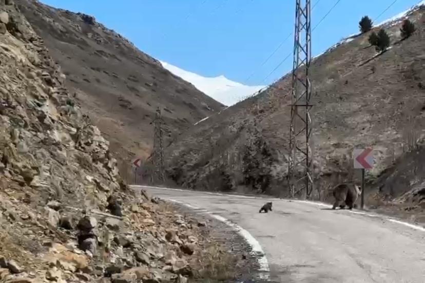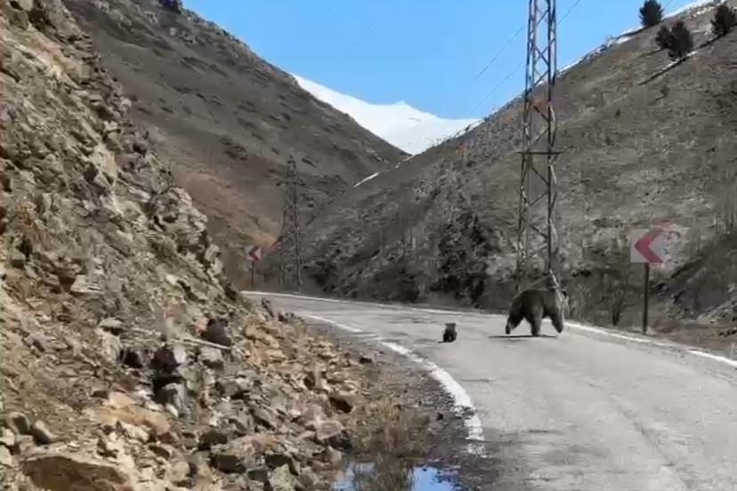 Gümüşhane merkeze bağlı Yağmurdere köyünde bir vatandaş tarafından kaydedilen görüntülerde, anne ayının iki yavrusuyla birlikte yolun karşısına geçmeye çalıştığı anlar yer aldı. Bu sırada yoldan araçların geldiğini fark eden anne ayı hızla yamaçtan aşağı doğru kaçtı. Yavrulardan biri annesini takip ederek onunla birlikte gözden kaybolurken, annesi ve minik kardeşinin kaçtığını fark edemeyen diğer yavru ise dağa tırmanmaya devam etmeye çalıştı.