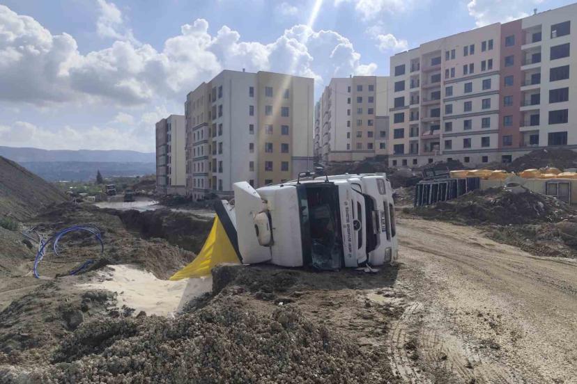Kaza, Defne ilçesi Koçören Mahallesi’nde yaşandı. Şantiye alanında ilerleyen kum yüklü 31 AFV 196 plakalı hafriyat kamyonu, bozuk yolda sürücüsünün direksiyon hakimiyetini kaybetmesiyle devrildi. Devrilen kamyon yan yatarken sürücüsü hafif şekilde yaralandı. Kamyonun kasasında bulunan kumsa yola döküldü.