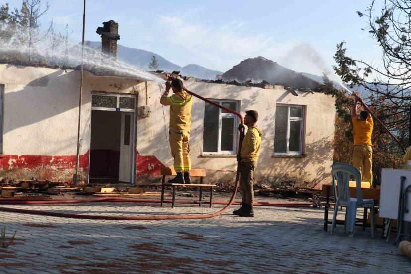 Antalya’da ormanlık alanda çıkan yangında eski okulun çatısı yandı