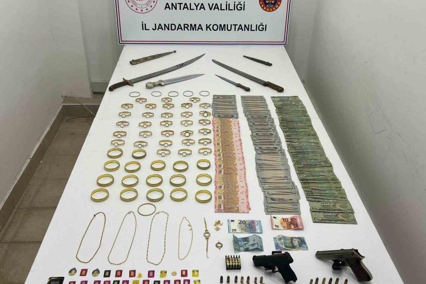 Antalya’nın Kepez ilçesinde düzenlenen operasyonda sahte altın, ruhsatsız silah ve sahte döviz ele geçirildi.