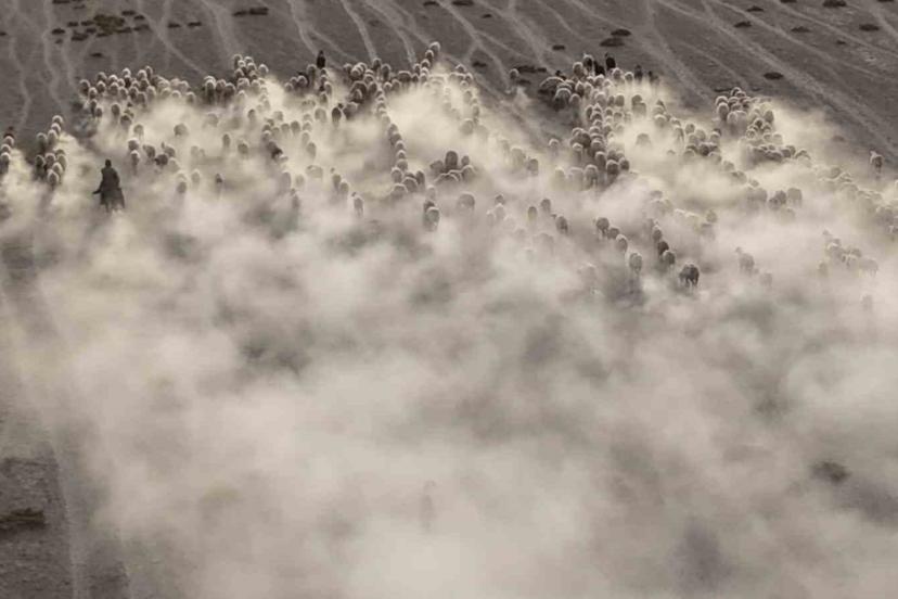 Arazide ilerleyen koyun ve kuzuların toz bulutlarıyla görüntüsü görsel şölen sundu