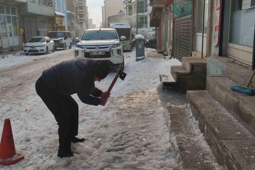 Gece saatlerinde hava sıcaklığının sıfırın altına düşmesiyle birlikte cadde ve sokaklar adeta buz pistine dönerken, özellikle iş yeri önlerinde oluşan kalın buz tabakası esnafa zor anlar yaşattı.