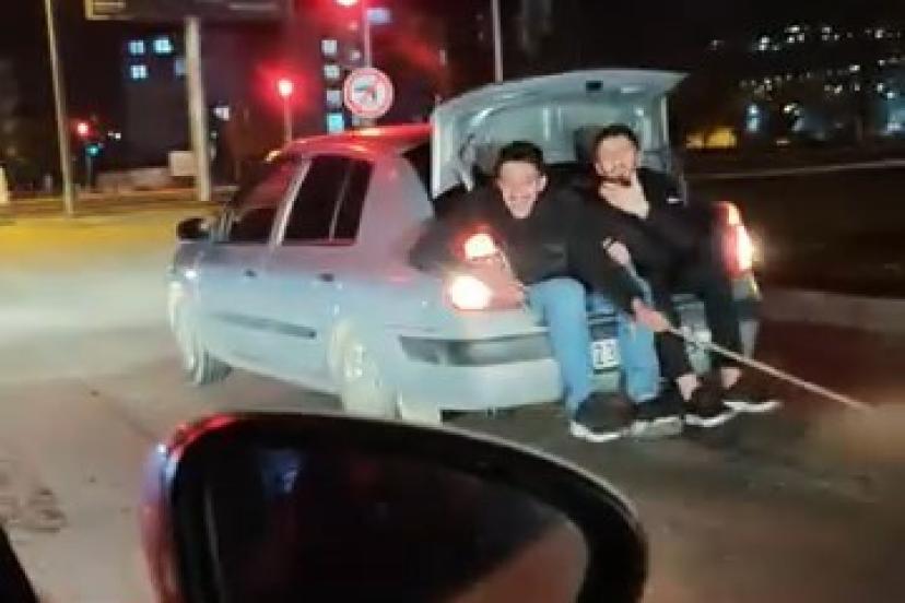Elazığ’da bir aracın bagaj kısmını oturan 2 kişi, arızalanan TOFAŞ Doğanı iple çekti.