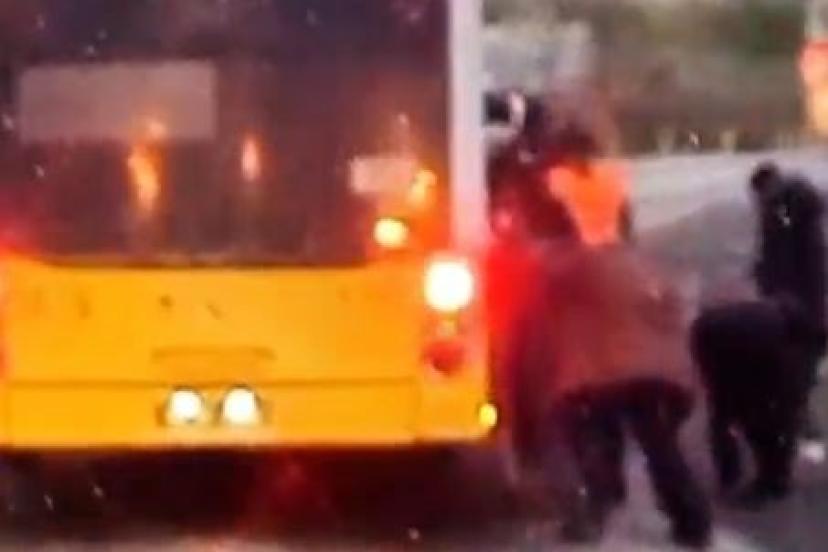 Arnavutköy’de ana cadde üzerindeki çamur nedeniyle yokuşu çıkamayan İETT otobüsünü vatandaşlar iterek kurtarmaya çalıştı. O anlar cep telefonu kamerasıyla görüntülendi.