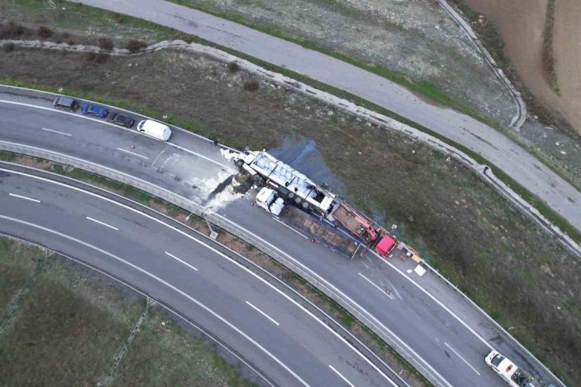 Tırda plastik ham maddesi olduğu öğrenilirken, kaza nedeniyle otoyolun tek şeridi trafiğe kapandı. Tonlarca plastik ham maddesi otoyola dökülürken, tırı yoldan kaldıra çalışmaları devam ediyor.