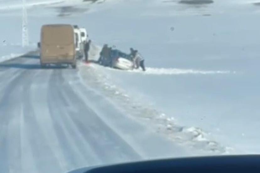 Edinilen bilgilere göre, yoğun kar ve buzlanma nedeniyle kontrolden çıkan araç yol kenarında kara saplandı. Durumu fark eden köylüler hemen harekete geçerek minibüs yardımıyla aracı bulunduğu yerden çekti.