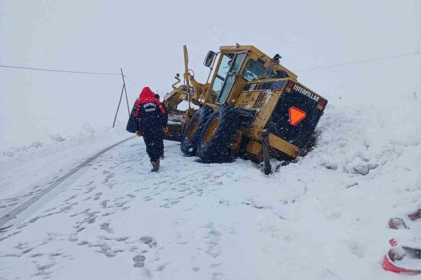 Bayburt’un Arpalı beldesinde karla mücadele çalışmaları sırasında bir iş makinesi kara saplandı.