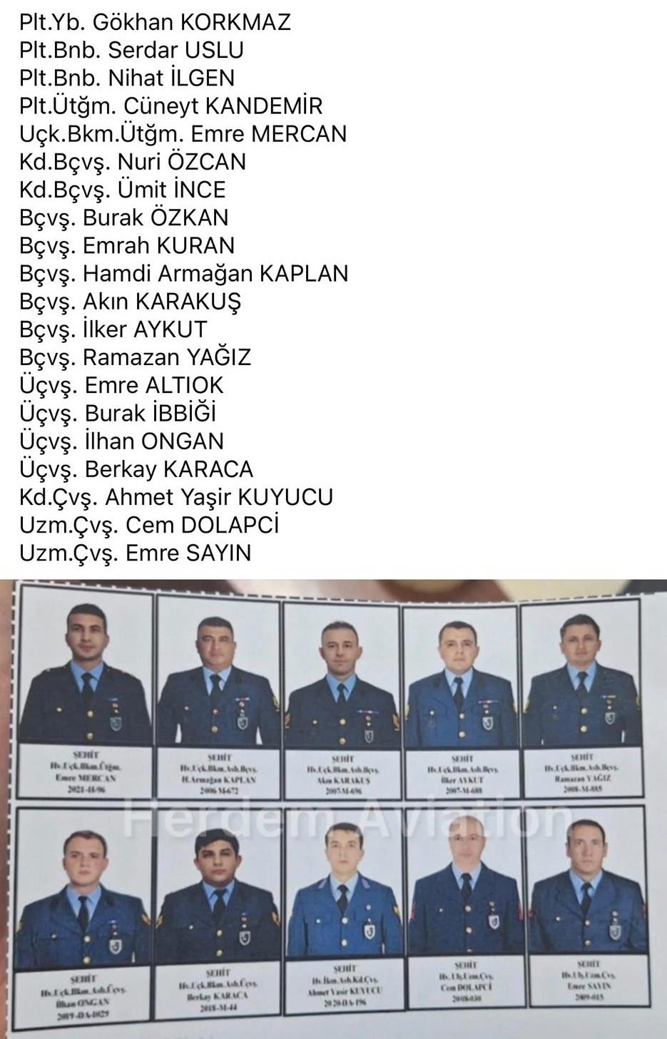 Kazada şehit olan askerlerin, Yenişehir doğumlu Hava Pilot Binbaşı Serdar Uslu ve Harmancık doğumlu Hava Uçak Bakım Astsubay Kıdemli Başçavuş Ramazan Yağız olduğu bildirildi.