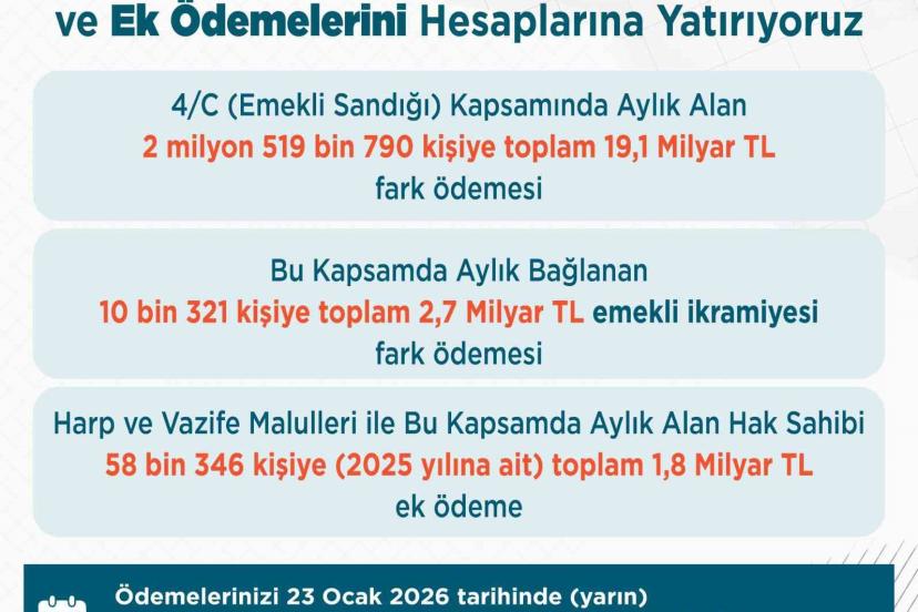 "Emekli Sandığı kapsamında emekli, malul, vazife malulü, dul veya yetim aylığı alan vatandaşlarımızın 2026 yılı zam farkları ile harp ve vazife malullüğü aylığı alan vatandaşlarımızın 2025 yılı ek ödemelerini yarın hesaplarına yatırıyoruz. Ülkemizin emektarları kıymetli emeklilerimiz başta olmak üzere vatandaşlarımıza hayırlı olmasını diliyorum."