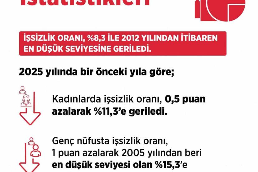 "Orta Vadeli Programımız (OVP), Ulusal İstihdam Stratejimiz (UİS) ve çalışma hayatını geliştirmeye yönelik politikalarımızın etkisiyle 2025 yılında önemli başarılara imza attık. Geçtiğimiz yıl yüzde 8,3 olarak gerçekleşen işsizlik oranı, 2012 yılından itibaren en düşük seviyesine geriledi. İşsiz sayısı, 2025 yılında bir önceki yıla göre 147 bin kişi azalarak 2 milyon 966 bin kişi oldu. Aynı dönemde kadınlarda işsizlik oranı, bir önceki yıla göre 0,5 puan azalarak yüzde 11,3’e geriledi. Genç nüfusta işsizlik oranı, 1 puan azalarak 2005 yılından beri en düşük seviyesi olan yüzde 15,3’e geriledi. Kadınların ve gençlerin çalışma hayatına katılımlarını artırmak için yürüttüğümüz programlarımızın olumlu sonuçlarını her geçen gün daha fazla almaya devam edeceğiz. İstihdam edilenlerin sayısı 32 milyon 566 bin kişi, istihdam oranı ise yüzde 49; işgücü 35 milyon 533 bin kişi, işgücüne katılma oranı ise yüzde 53,5 olarak gerçekleşti. İşgücümüz ve çalışma hayatımız güçlendikçe Türkiye güçlenecek. Cumhurbaşkanımızın liderliğinde, ekonomi modelimizin parolası olan yatırım, istihdam, üretim ve ihracat odaklı politikalarımızı uygulamayı sürdüreceğiz. Türkiye Yüzyılı bu temeller üzerinde yükselecek."