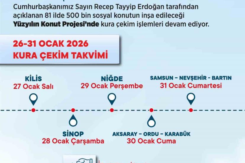 Yeni haftanın takvimine göre 27 Ocak salı günü Kilis’te bin 170, 28 Ocak Çarşamba Sinop’ta 947, 29 Ocak Perşembe Niğde’de 2 bin 604, 30 Ocak Cuma Aksaray’da 2 bin 353, Ordu’da 3 bin 334 ve Karabük’te bin 600, 31 Ocak cumartesi günü ise Samsun’da 6 bin 397, Nevşehir’de 2 bin 368 ve Bartın’da bin 620 konut için kura çekimi yapılacak. 26-31 Ocak haftasında toplam 22 bin 393 sosyal konutun daha hak sahipleri belirlenecek. Böylece 31 Ocak’ta kurası tamamlanan il sayısı 41’e, hak sahipleri belirlenen konut sayısı ise 143 bin 658’e yükselecek.