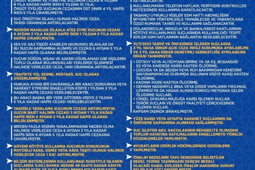 Adalet Bakanı Yılmaz Tunç, TBMM Genel Kurulunda kabul edilen ve kamuoyunda 11. Yargı Paketi olarak bilinen ‘Türk Ceza Kanunu ile Bazı Kanunlarda Değişiklik Yapılmasına Dair Kanun Teklifi’nin ardından sosyal medya hesabın açıklama yaptı. Bakan Tunç, "TBMM Genel Kurulunda kabul edilen ve kamuoyunda 11’inci Yargı Paketi olarak bilinen ‘Türk Ceza Kanunu ile Bazı Kanunlarda Değişiklik Yapılmasına Dair Kanun Teklifi’nin hayırlı olmasını diliyorum. Türkiye Yüzyılı Yargı Reformu Strateji Belgemizde yer alan hedefler doğrultusunda hazırlanan yargı paketiyle; toplumsal huzurun desteklenmesi, suçla daha etkin mücadele edilmesi, temel hak ve özgürlüklerin daha etkin korunması, hukuki güvenliğin güçlendirilmesi, adalet hizmetlerimizin etkinliğinin artırılması, infaz adaletinin sağlanması alanlarında önemli düzenlemeler hayata geçirilmiştir. Kanun teklifinin yasalaşma sürecinde emeği ve katkısı bulunan tüm milletvekillerimize teşekkür ediyorum. Cumhurbaşkanımız Recep Tayyip Erdoğan’ın liderliğinde hukukun üstünlüğünü esas alan, gecikmeyen ve öngörülebilir bir adalet sistemi vizyonuyla çalışmalarımızı sürdüreceğiz. Türkiye Yüzyılı’nı adaletin yüzyılı yapmak için adımlarımızı kararlılıkla atmaya devam edeceğiz" ifadelerini kullandı.