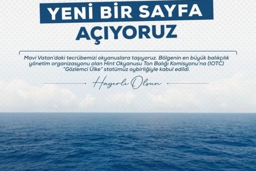 Tarım ve Orman Bakanı İbrahim Yumaklı, "Mavi vatandaki tecrübemizi okyanuslara taşıyoruz. Dünyanın en önemli bölgesel balıkçılık yönetim organizasyonlarından biri olan Hint Okyanusu Ton Balığı Komisyonu (IOTC) nezdinde ’gözlemci ülke’ statümüz oy birliğiyle kabul edildi" dedi.