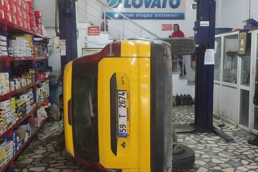Tekirdağ’ın Çerkezköy ilçesinde bakım için oto servisine bırakılan taksi, liftte bulunduğu sırada düşerek hasar gördü.