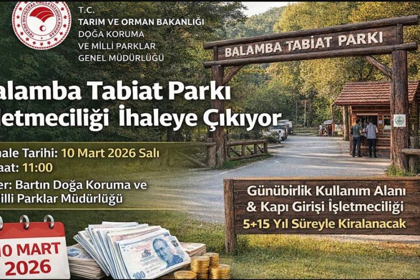 Doğa Koruma ve Milli Parklar Müdürlüğü tarafından, Balamba Tabiat Parkı’nın günübirlik kullanım alanı ve kapı giriş işletmeciliği 5 yıldan 15 yıla kadar süreyle kiralanacağı bilgisi paylaşıldı. Park işletmeciliğinin 2 bin 886 sayılı Devlet İhale Kanunu’nun 35’inci maddesi uyarınca "Kapalı Teklif Usulü" ile muhammen (tahmini) olarak 442 bin 232,60 TL üzerinden ihaleye çıkacağı belirtildi. İhale, 10 Mart 2026 Salı günü saat 11.00’da Bartın Doğa Koruma ve Milli Parklar Müdürlüğü’nde gerçekleşecek.