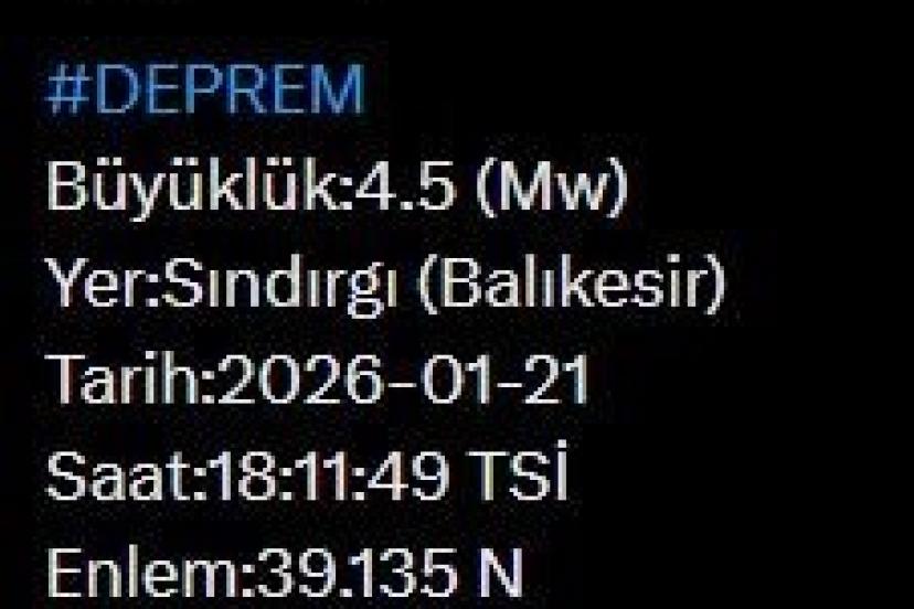 AFAD’dan alınan bilgiye göre, merkez üssü Balıkesir’in Sındırgı ilçesi olan saat 18.11’de 4.5 büyüklüğünde deprem meydana geldi. Depremin derinliği 11.58 kilometre olarak ölçüldü.