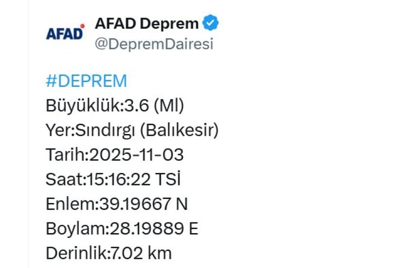 AFAD’ın paylaştığı bilgilere göre, Balıkesir’in Sındırgı ilçesinde saat 15.35’de 4.9 büyüklüğünde deprem meydana geldi. Depremin derinliği ise 11.02 kilometre olarak kaydedildi.