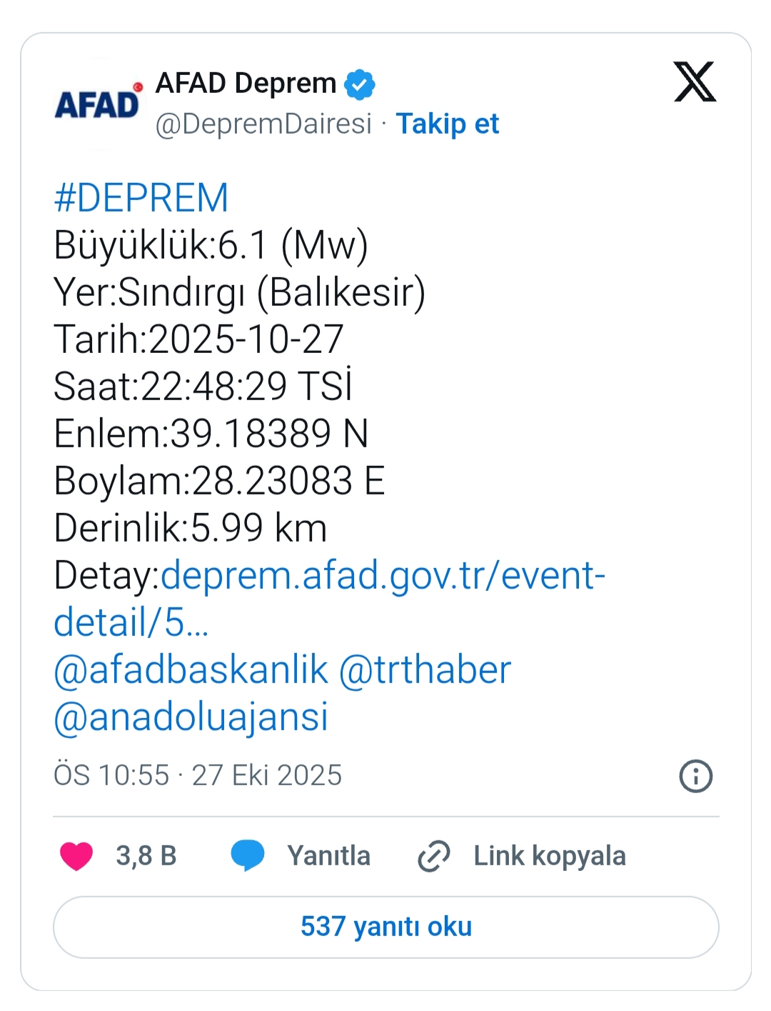AFAD, saat 22.48'de merkez üssü Balıkesir'in Sındırgı ilçesi olan 6,1 büyüklüğünde deprem meydana geldiğini bildirdi. Deprem yerin 6 kilometre derinliğinde gerçekleşti.