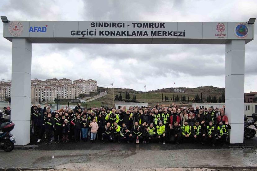 Sındırgı Tomruk Geçici Konaklama Merkezi’de prefabrik deprem konutlarını ziyaret eden Motosikletliler, depremlerden etkilenen vatandaşlara yiyecek erzak, oyuncak ve battaniye yardımında bulunurken, esnafa da destek olmak için alışveriş yaptılar.