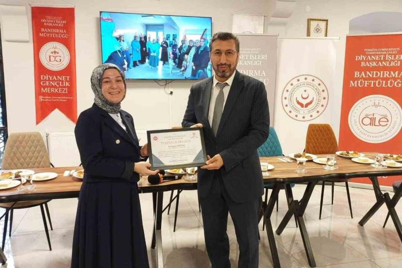 Belge töreni Bandırma Diyanet Gençlik Merkezi’nde gerçekleştirildi. Törene Bandırma İlçe Kaymakamı Engin Aksakal, Balıkesir Aile ve Sosyal Hizmetler Müdürü Emine Böçkün, Bandırma İlçe Müftüsü Dr. Abdulhamid Pehlivan, İlçe Millî Eğitim Müdürü Mutlu Aslan ve davetliler katıldı.