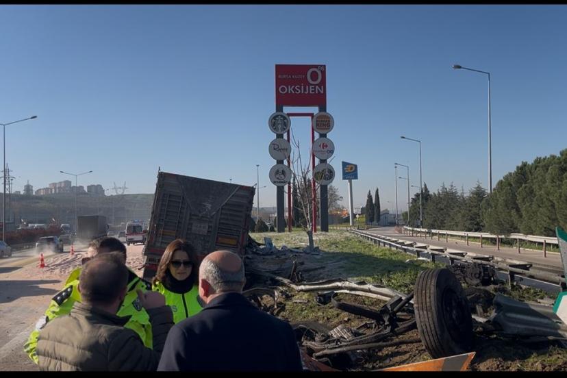 İstanbul İzmir Otoyolu Bursa çevre yolunda dinlenme tesislerinin bariyerine çarpan kamyonun kabininde sıkışan sürücü Büyükşehir Belediye itfaiyesi ekiplerinin nefes kesen poerasyonuyla kurtarıldı. Kurtarma ekipleri demir yığınlarında sıkışan sürücüyü "dayan" diyerek teselli etti. Yaklaşık yarım saatlik çalışmayla kurtarılan sürücünün kaburgasında kırıklar olduğu bildirildi.