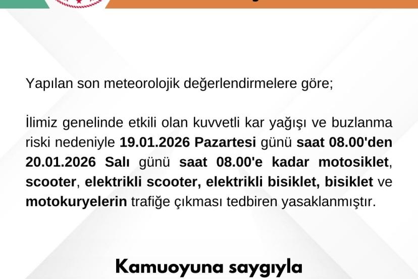 Bartın Valiliği’nden yapılan açıklamada, ’Yapılan son meteorolojik değerlendirmelere göre, ilimiz genelinde etkili olan kuvvetli kar yağışı ve buzlanma riski nedeniyle 19.01.2026 Pazartesi günü saat 08.00’den 20.01.2026 Salı günü saat 08.00’e kadar motosiklet, scooter, elektrikli scooter, elektrikli bisiklet, bisiklet ve motokuryelerin trafiğe çıkması tedbiren yasaklanmıştır. Kamuoyuna saygıyla duyurulur’’ ifadeleri kullanıldı.