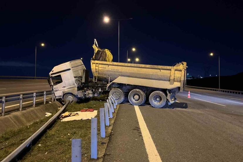 İstanbul Kuzey Marmara Otoyolu Başakşehir mevkiinde seyir halindeki hafriyat kamyonu önce serbest geçiş sistemi direğine çarpıp ardından bariyere girdi. Kazada sürücü ağır yaralandı.