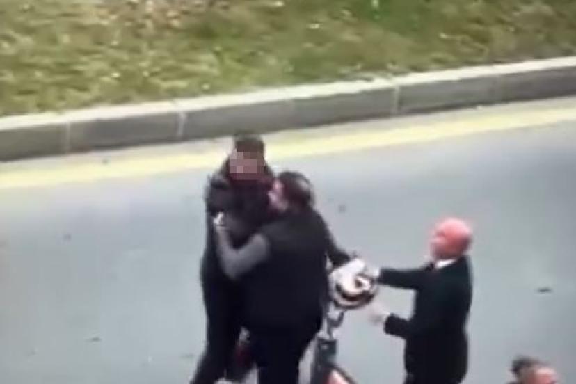 Kavga sırasında, hafif ticari araç sürücüsü, motosikletli babaya yanında bulunan küçük çocuğun gözleri önünde saldırdı. Taraflar birbirlerine tekme, yumruk ve kaskla vururken, çevredeki vatandaşlar kavgayı ayırmakta güçlük çekti. Yaşanan kavga anları, olay yerinde bulunan bir vatandaş tarafından cep telefonu kamerasıyla saniye saniye kaydedildi.