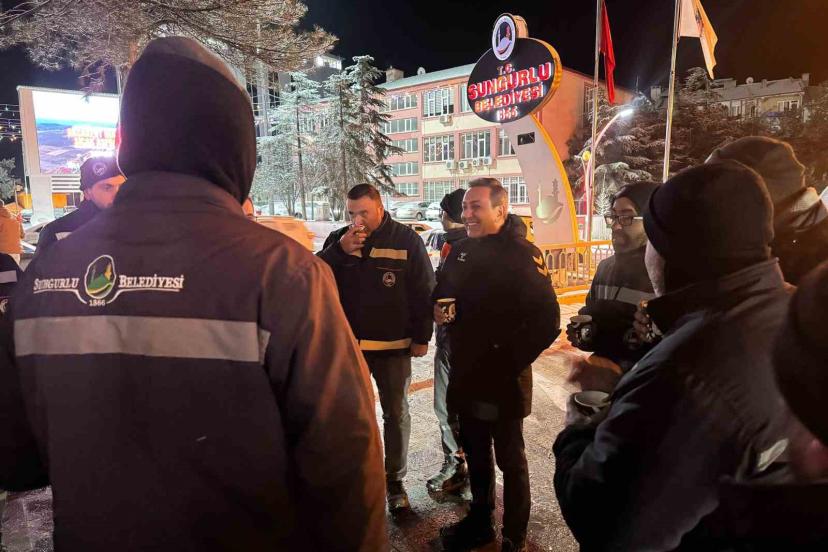 Sungurlu Belediye Başkanı Muhsin Dere, karla mücadele eden personele kahve ikram etti.