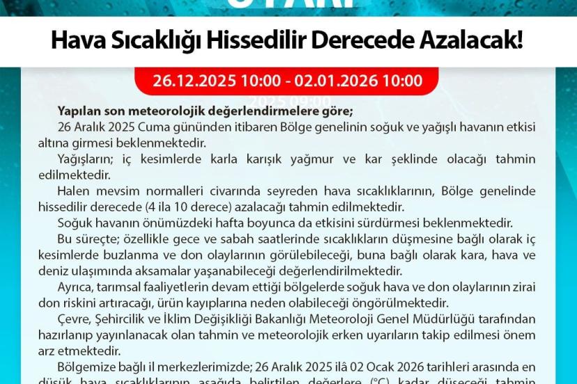 Meteoroloji Genel Müdürlüğü, 26 Aralık 2025 ile 2 Ocak 2026 tarihleri arasında bölgeye bağlı il merkezlerinde en düşük hava sıcaklıklarının eksi değerlere kadar düşebileceğini belirterek, yayımlanacak tahmin ve meteorolojik erken uyarıların yakından takip edilmesinin önem taşıdığını vurguladı.